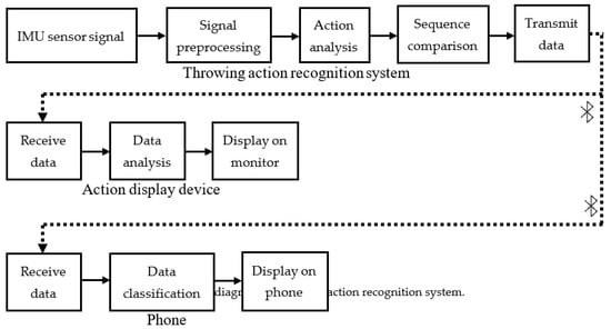 The real-time assist system for upper extremity throwing action can be used for learning, rehabilitation, and rectification purposes. Figure 5 shows the block diagram of the developed assist system. In this work, we have integrated multiple software and hardware technologies to achieve all the functionalities of the proposed assist system. The functionality of the proposed assist system can be divided into three parts as per the architecture shown in Figure 5, namely throwing action recognition, real-time throwing action data analysis, and display of statistical information. The throwing action recognition of the proposed assist system comprises different stages including signal acquisition using IMU sensors, signal pre-processing, posture interval definition, vector space conversion, sequence comparison, and throwing action identification.