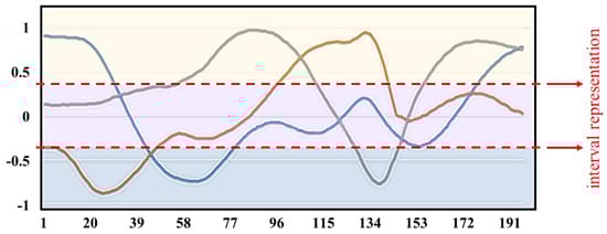 Acceleration signal after normalization procedure and its interval definition. The x-axis acceleration signal is represented by a blue line, the y-axis acceleration signal is represented by an orange line, and the z-axis acceleration signals is represented by a gray line.