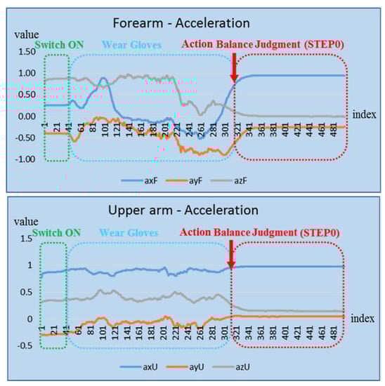 Before wind-up (Step 1) of the upper-body throwing phase, the signal should be processed based on getting ready status corresponding to Step 0 in the definition of the upper arm posture phase. The main purpose of this procedure is to prevent the user from wearing the device incorrectly so that the system function will not be affected adversely. Step 0 also helps to isolate the noise signal that affects the throwing action recognition accuracy. Figure 8 depicts the action balance judgment for the getting ready status. Based on the trend of the waveforms of the forearm and upper arm defined under different action zones and with the help of signal analysis and processing, the correct posture and inappropriate posture of the forearm and upper arm can be clearly distinguished. The difference between these rules is then used to define the throwing action database sequence.
