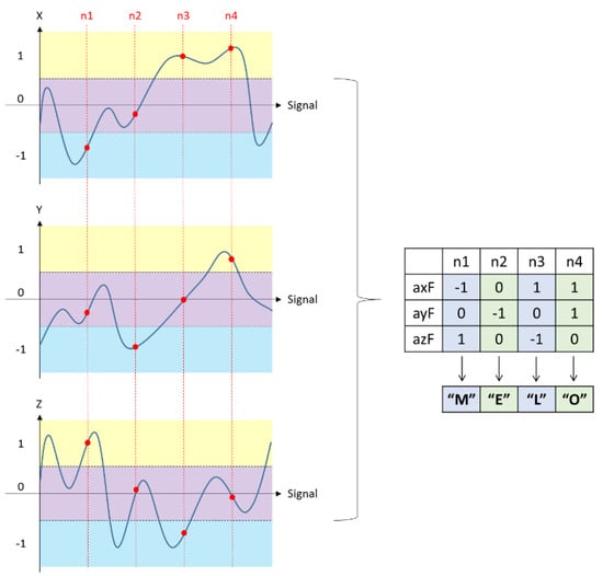 After defining the different action zones, vector space representation of the signal is carried out. Based on the labeling technique followed in this system, “1” and capital letters “A–Z” are used to represent the 27 kinds of symbols quantified by the acceleration of the forearm; “2” and lower case “a–z” represents the acceleration of the upper arm. The action sequence conversion process based on the labeling technique is described in Table 1. Analyzing Table 1, we can get a clear idea of how we have used the labeling technique in this work. Moreover, we have detailed the action sequence conversion process based on the labeling technique using an apt example given in Figure 9.