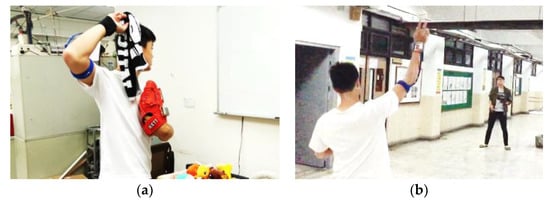 In order to verify the usability and authenticity of the developed wearable assist system for upper extremity throwing action, we have carried out several experiments including empty-handed simulation of the upper extremity throwing action, towel throwing method, and baseball throwing method to simulate the actual throwing posture. Figure 11 depicts the towel throwing and baseball throwing experiments we have conducted to test all kinds of upper extremity throwing actions as part of the work.