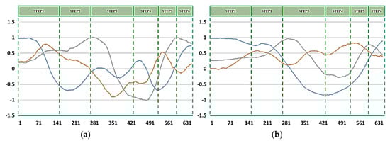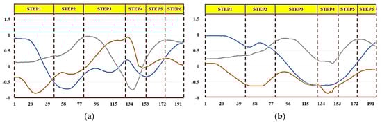 Complete action signal of the right hand: x-axis acceleration signals (blue line); y-axis acceleration signals (orange line); z-axis acceleration signals (gray line). (a) forearm, (b) upper arm.