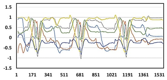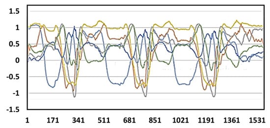 It is to be noted that the acceleration signal captured by IMU sensors may be distorted due to the noise and vibrations of the sensor itself. Hence, it is important to eliminate the noise of the signal to maintain a better accuracy of the action recognition system. Therefore, a signal pre-processing stage is critical and thus we have fed the acceleration signal captured by the IMU sensors to the signal pre-processing stage. Assuming the distribution of the acceleration signal noise is Gaussian, we have chosen the Kalman filter as the best estimator [31]. When we analyze the acceleration signal captured using IMU sensors before and after applying the Kalman filter, it is evident that we were successful in eliminating noise from the signal to a greater extent. Moreover, we carried out the normalization procedure also in the signal pre-processing stage. The acceleration signal is normalized after applying the Kalman filtering technique to maintain the accuracy of the proposed action recognition system. Figure 6 shows the acceleration signal after applying the normalization procedure. Based on positive and negative values from the signal pre-processing stage, the thresholds corresponding to the system are set using the leveling technique. The threshold value for the signal triad is set to +0.35 and −0.35. The definition greater than +0.35 is set as 1, the definition between +0.35 and −0.35 is set as 0, and the definition below −0.35 is set as −1 based on the leveling technique. The forearm acceleration signal interval representation can also be visualized in Figure 6 where the yellow zone, the purple zone, and the blue zone represent the different action zones. The acceleration signal is divided into different action zones for the precise throwing action analysis. By defining different action zones based on the aforementioned threshold values we set, we could achieve better action sequence conversion based on the labeling technique which is followed in the throwing action analysis.