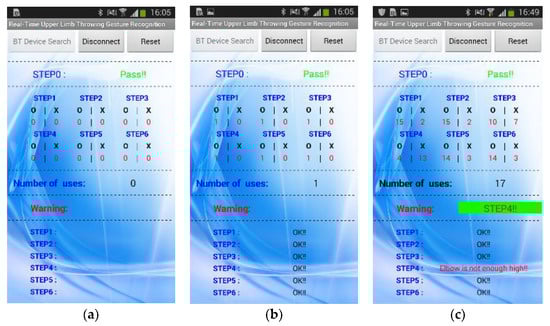 We have further tested the practicality of the developed upper extremity throwing action assist system by carrying out experiments involving consecutive multiple throws using both hands. The continuous action signal during multiple throws using the right hand and the left hand are depicted in Figure 15 and Figure 16, respectively. Furthermore, the user can view the real-time upper extremity throwing action results in the display device attached at the glove end and also mobile phone. Figure 17 shows the mobile phone interface we have developed and connected to the throwing action recognition system. In an improper throwing action, the user can clearly understand in which stage he has gone wrong by checking their mobile phone and can try to correct that particular phase as shown in Figure 17. After the user completes a correct upper extremity throwing cycle, the display device will output “S1: OK!!”, “S2: OK!!”, “S3: OK!”, “S4: OK!!”, “S5: OK!!”, and “S6: OK!!”. Furthermore, an instant message will be sent to the mobile phone following the throwing action. The mobile phone message when an incomplete upper extremity throwing action was performed can be visualized in Figure 17c. In this scenario, as the elbow of the user is not high enough, the mobile phone interface has displayed the message as “STEP1: OK!!” “STEP2: OK!!”, “STEP3: OK!!”, “STEP4: Elbow is not enough high!!”, “STEP5: OK!!”, and “STEP6: OK!!”. From this experimental result, it is evident that how accurately the developed assist system recognizes the problems in throwing action.