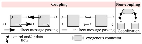 In our view, connectors in a system architecture can be one of three types, as shown in Figure 2: (i) direct message passing; (ii) indirect message passing; and (iii) coordination. In direct message passing, one component’s service code has service call/request of another specific component. In indirect message passing, one component’s service code has service call/request of another component connected via a required service. In coordination, a program unit makes the service requests to the connected components without components knowing each other. We categorise the first and second types of connectors as coupling connectors, and the third type as non-coupling connectors. Coupling connectors couple two components for control flow, i.e., control initiates or flows from one component to another. On the contrary, non-coupling exogenous connectors do not couple components for control or data flows. Components are coupled with the connectors, or vice versa, for the control or data flow. There can be many different types of exogenous connectors, where each type may define a unique control and/or data flow for the composed components.