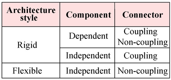 Composition of dependent components with connectors for coupling or non-coupling defines the rigid system architecture. Data abstraction and object-oriented organisation style from Garlan and Shaw [13] corresponds to our category for dependent components and coupling connectors for making direct coupling between components. Event-based implicit invocation and layered systems from Garlan and Shaw [13] correspond to the same category for making indirect coupling between independent components by assuming these have no unspecified dependency. Therefore, data abstraction and object-oriented organisation, event-based implicit invocation and layered systems styles are rigid architecture styles.