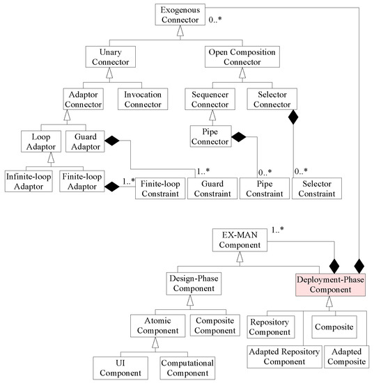 Using UML class diagram notation [20], we create the conceptual model for EX-MAN, as shown in Figure 4. The purpose of this conceptual model is to show necessary features of EX-MAN model. As shown in Figure 4, a system in EX-MAN is referred to as a deployment phase component for deployment, which is a collection of (shown by UML composition symbol) one or more components and zero or more connectors. This system can be one of four kinds, as shown in Figure 4. The system can be a collection of components and connectors, as shown in Figure A4.