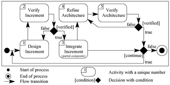 A pass of incremental composition process (ICP) is: (i) build increment design for a requirement as Activity 1; (ii) verify the increment design as Activity 2; (iii) integrate the increment as Activity 3 and a partial architecture from previous pass except for first requirement; (iv) in Activity 4, refine the integrated partial architecture in zero or more steps by following the refinement rules if needed; and (v) verify the integrated partial architecture in Activity 5. The composition process ends with the last pass to compose the last increment for the last requirement. For verification, each increment design is validated as per the defined component model in Section 3.