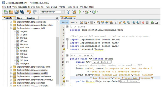During the process of incremental composition of composite components to be stored in the repository and systems to be deployed, the intermediate composites were executed to verify the properties of the composition proposed by ICP in Section 4.2. We show the code of atomic component AP in Figure 12. The role of this component is to read air pressure values from the connected sensor and to compute the minimum, maximum and average air pressure values from these sensor read values. In WIS package, the nine atomic components and two composite components can be seen in the package in Figure 12 (left).