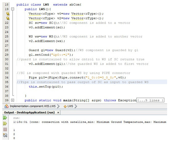 In Figure 13, the code of a composite component LWS is shown. The necessary description of the code is included as comments in the code file. In this figure, the output window shows the output of the program. The purpose of this figure is to show how the functionality of the partial system is carried out during the system construction process. With this output, the interface of the component service and the results of this service execution are printed and verified with the generated data of each component in the composite.