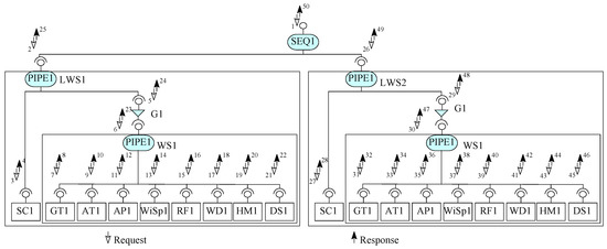 To describe the flow of control and data in the complete system in Figure 11, we show the detailed system in Figure 14. In this figure, the flow of request into a component and the flow of response out of a component is shown with the help of numeric tagging with the flow arrows. With the help of numeric tagging, we try to show the flow of requests control/data from WIS to WS, as shown in Figure 14. The shown system’s service execution begins with a request labeled “1” and ends with the response labeled “50”.