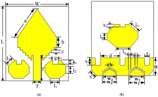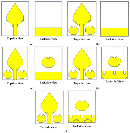 The proposed resonator-based UWB antenna constructs a diamond-shaped radiating patch and a ground plane fronting 180° in respect of each other. For a simple explanation, including the final design with several modification sequences of the antenna are illustrated in Figure 3. The width and length of the prototype are denoted by W and L, respectively. A slotted rectangular-shaped plane linked to the ground. The length and width of this shape are denoted by W and H. The height of the staircase slots of the patch is denoted by c. Three rectangular-shaped slots each has been cut out at the top of the ground plane of the antenna with the height and width denoted by h2 and s, as well as the distance between two slots, are denoted by d due to enhance the reflection coefficient under −10 dB and improve the gain of the antenna. The staircase-shaped zigzag slots have been used to enhance the gain and radiation directivity of the antenna [28]. In this work, four staircase-shaped two irregular zigzag slots have been cut out at the lower portion of the ground plane. It is called irregular because the size, length, staircase shape widths are different. The bottom staircase width of both zigzag slots is the same, and it is denoted by p, but top staircase widths are different, which are denoted by i and t. The main goals of these irregular staircase-shaped zigzag slots are (i) to enhance the reflection coefficient under −10 dB, (ii) to produce three resonance frequencies under −20 dB (iii) to increase the antenna gain and (iv) to improve the bandwidth for UWB antenna. With the help of four steps staircase-shaped zigzag slot edges on the ground plane, improve the radiation directivity due to the proper movement of the surface current distribution. It is investigated that if only one irregular zigzag slot is used, then the reflection coefficient curve is changed, and it is far away from the −10 dB, as well as gain, is decreased, because of the lack of proper movement of surface current. The two octagonal, rectangular slotted ring-shaped parasitic elements have been placed alongside the feed line. The lengths of arms of both parasitic elements are denoted by l1, l2, and l3. The height and width of the middle rectangular-shaped slot of both parasitic elements are denoted by h1 and g, respectively. Furthermore, one octagonal, rectangular slotted ring-shaped parasitic element has attached in the middle of the backside of the substrate, and length of arms are denoted by l4, l5, and l6. The height of the middle rectangular-shaped slot of the backside parasitic element is denoted by h1, and the width is the same as g.