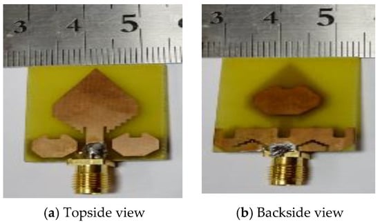 Here, c represents the speed of light in free space, represents the resonance frequency. The overall compact dimension of the proposed antenna is 29 × 24 × 1.5 mm3. The initial dimension of the proposed parasitic resonator based UWB antenna is taken based on the patch antenna design Equations (1)–(3). After that, we have used 3D electromagnetic simulator CST to optimize the design parameters for achieving the required impedance bandwidth, gain and efficiency. The diamond-shaped patch and two octagonal, rectangular slotted ring-shaped parasitic elements are designed on top of the substrate and then, one octagonal, rectangular slotted ring-shaped parasitic element and partial slotting ground plane are designed on the backside of the substrate. In this antenna design, the diamond-shape with an incremental staircase patch is working as the main radiating element. One octagonal, rectangular slotted ring-shaped parasitic element is placed in the middle position of the backside of the substrate for increasing the directivity of the radiation of the antenna. The width of the ground plane is 24 mm, and the height is 7 mm. The feed line width is 3.00 mm and 9.8 mm in height, and it is directly linked to the main radiating patch as well as was fed with a 50 Ω SMA (subminiature version A) connector. The dielectric constant and electrical conductivity of the SMA connector is 2.08 and 4.62 × 104 S/m, respectively. These components are tweaked in an intelligent way to attain the required antenna performance. In addition, two octagonal, rectangular slotted ring-shaped parasitic elements are situated alongside the feed line to enhance the reflection coefficient, and a 0.5 mm gap has reserved to increase the bandwidth. This gap reduces the effect of the inductive reactance and increases the capacitance at the feed point, which is the main physics to increase the bandwidth. The width of the feed line, the presence of octagonal, rectangular slotted ring-shaped parasitic elements as well as five staircases of the antenna have a strong effect on the matching of the impedance. The parasitic elements are also helped to increase the resistance and reduce the reactance of the antenna in the lower frequencies. As a result, the gain in the main lobe is increased and the side lobe level is concurrently reducing. It is investigated that an octagonal ring-shaped parasitic element properly distributed surface current and help to comparatively reduce the radiation loss instead of other shapes [38]. The staircase diamond-shaped radiating patch is electronically coupled with the ground plane and parasitic elements, and it further enhances the bandwidth. In this work, we have designed a slotted resonator based UWB antenna to achieve the UWB features. The slotting technique is one of the popular techniques to enhance the antenna performance such as gain, radiation directivity, and bandwidth of the antenna [28]. The parasitic resonator also helps to enhance the antenna features such as gain, radiation directivity, and bandwidth of the antenna [9]. In this work, the idea of the slotting technique is inspired by the fractal antenna design [39]. In the proposed antenna design rectangular-shaped and staircase zigzag-shaped slots are used which are located on the radiating patch, parasitic elements, and ground plane as the current distribution observed at the highest concentration. A set of calculations has been carried out for each slot on the radiating patch, parasitic elements and ground plane of the antenna. As a result, the improvement slotted design has created an enhancement in antenna performances such as reflection coefficient, gain, efficiency, and radiation directivity [28]. In general, the traditional antenna design such as patch and ground is more likely characterized as the resistor, while the different types of the slot are defined as an RLC resonator [40]. The different types of slot designs are useful in controlling the antenna’s performances [41]. Furthermore, the slots have been used to diminishing the current flow at any region of the ground or patch. In general, the resonant wavelength of each slot can be calculated by using the following formula: