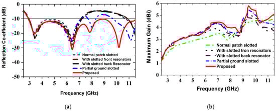 Figure 4 illustrates the effect of the octagonal, rectangular slotted ring-shaped parasitic elements and ground slotting on the reflection coefficient (i.e., S11 parameters) and maximum gains according to the design sequence of Figure 3. At first, all slots etched from the patch, parasitic elements, and ground plane as mentioned size in Table 1. After that, we analyzed and investigated the antenna parameters. Lastly, a satisfactory outcome is attained with the modifications which show the desired features of the UWB antenna. From Figure 4a, the overall observation demonstrates that the proposed prototype has extensive bandwidth compared to the other verified shapes, including normal patch slotted design, with slotted front resonator design, with slotted back resonator design and partial ground slotted designs. Firstly, in normal patch slotted design (i.e., Figure 3a), the operating frequency is 2.78 GHz to 7.34 GHz with one resonance frequency under −20 dB, but the reflection coefficient curve is very close to −10 dB at 4.64 GHz. Secondly, when two octagonal, rectangular slotted ring-shaped parasitic resonator elements are placed alongside the feed line of the radiating patch (i.e., Figure 3b), then generate two resonance frequencies under −20 dB. The beginning frequency has shifted from 2.78 GHz to 2.79 GHz, and higher frequency has shifted to 7.31 GHz, so bandwidth is slightly decreased, but it helps to increase the radiation directivity. In this case, the overall bandwidth is 2.79 GHz to 7.31 GHz. Thirdly, when two octagonal, rectangular slotted ring-shaped parasitic resonator elements are placed alongside the feed line of the radiating patch, and one octagonal, rectangular slotted ring-shaped parasitic resonator element placed in the middle of the substrate (i.e., Figure 3c), then generates one resonance frequency providing a reflection coefficient lower than −23 dB and generates another resonance frequency providing a reflection coefficient lower than −28 dB. In this way, the new antenna’s operating frequency is 2.79 GHz to 7.32 GHz. So, the upper frequency is slightly increased as well as it also helps to increase the radiation directivity, but it does not cover the UWB. In this scenario, it is observed that the reflection coefficient curve is far away from the −10 dB between 7.32 GHz to 11.18 GHz; however, this problem is partially solved by design four (i.e., Figure 3d). By applying three rectangular slots on top of the ground plane, the beginning frequency has shifted to a lower frequency of 2.79 GHz and then generated two resonance frequencies; the first one resonance frequency provides a reflection coefficient lower than −20 dB and another under −26 dB. It means that this modification also helps to enhance the radiation directivity, as well as the reflection coefficient, which is slightly lower −10 dB. However, in this scenario, the overall bandwidth is 2.79 to 7.33 GHz, but it also does not cover UWB. Also, in the proposed design (i.e., final design (Figure 3e)), by applying two irregular staircase shaped zigzag slots and chamfered the left and right corner of the ground plane, then generated three resonance frequencies providing reflection coefficients lower than −10 dB; the first one is under −20 dB, the second one is under −33 dB and the third one is under −31 dB. Therefore, the lower frequency begun from 2.80 GHz as well as the upper frequency is shifted to 11.50 GHz. Consequently, it extended the operational upper frequency by about 4.18 GHz (7.32 to 11.50 GHz), as well as produced overall operating frequency from 2.80 GHz to 11.50 GHz with a reflection coefficient lower than −10 dB, which is covered entire UWB. However, the use of parasitic elements and different types of slots generates some additional current-conducting paths. This modification, variation the inductance and capacitance of the input impedance of the antenna, which indicates changes in the prototype features. The simulated maximum gain curves for the several modifications are illustrated in Figure 4b. At a glance, the maximum gains for the different modification structures are demonstrated in Table 2. The maximum gain of the prototype is 5.8 dBi, whereas the normal patch slotted, with slotted front resonators, with slotted back resonator and partial ground slotted antenna, has a gain of 3.47, 3.89, 4.36 and 4.40 dBi respectively. It is observed that the gain is gradually increased with respect to frequencies from 2.80 GHz to 7.50 GHz, 8.80 GHz to 9.45 GHz, as well as 10.5 GHz to 11.50 GHz. At these frequencies, the gain is increased due to the higher efficiency of the antenna. Furthermore, the gain is slightly decreased between 7.50 GHz to 8.80 GHz as well as 9.45 GHz to 10.50 GHz. The main reason for this incident is that the efficiency is slightly lower, as well as generates some back lobes [9]. Besides, these incidents happened due to applying different types of slots in both patch and ground. The slots distribute the current conduction path and raise the electrical length as well as generating strong directional radiation owing to the mitigation of the surface current [9,14,28]. Therefore, the different modifications have an important effect on the gain and efficiency of the antenna. However, the overall gain is increased, and the maximum gain reached 5.8 dBi at 9.45 GHz. Finally, the performance evaluations of the effects of various antenna design structures/modifications are presented in Table 2.