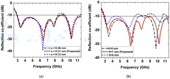 Effect of the variation of the antenna parameters on reflection coefficient (S11): (a) When a = 12.50 mm, 13.31 mm, and 13.73 mm; (b) When H = 8 mm, 7 mm, and 6 mm.
