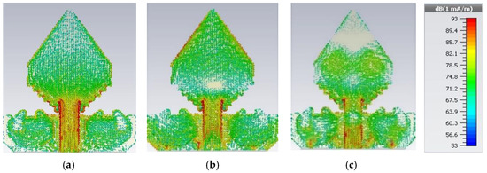 Simulated surface current distribution at: (a) 3.50 GHz; (b) 6.45 GHz; and(c) 10.20 GHz.
