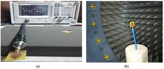 The proposed prototype’s performance has been analyzed and simulated by using CST microwave studio 2018 simulator software. Moreover, plotting the simulated results, the data analysis software Origin Pro 2018 (OriginLab Corporation, MA, USA) has been used. Furthermore, by using the PNA network analyzer (Agilent Technologies, Inc., N5227A 10 MHz–67 GHz) is used to measure the reflection coefficient (S11) parameters, and the setup is illustrated in Figure 7a. On the other hand, the UKM Satimo near field StarLab (Microwave Vision Group, Paris, French) is used to measure the radiation pattern, efficiency, as well as gain of the fabricated prototype. The mechanism is used for measuring the electric fields (EF) of the prototype in the near field zone because of calculating the corresponding far-field quantities of the AUT (Antenna under test). The AUT is situated in the central point of a circular “arch” and positioned on the testbed that comprises sixteen distinct receiving antennas. In this system, the antennas are positioned in a ring-shaped model with maintaining an equal distance. Generating a full three dimensional (3D) scan, the AUT is rotated 360 degrees horizontally, and after that, we get the three dimensional (3D) radiation pattern. Figure 7a illustrates the PNA measurement set up, and Figure 7b illustrates the Satimo StarLab setup. Through the SatEnv software, the near field data are transformed into far-field data. Furthermore, from the far-field data, the antenna gain, efficiency, and radiation pattern are calculated by using the SatEnv software.