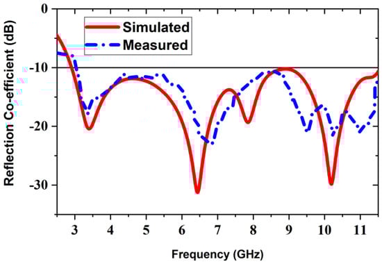 Measurement and simulated reflection coefficient (S11) of the proposed antenna.