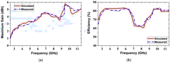 In this domain we discuss different characteristics of the realized antenna. Figure 8 demonstrates the simulated and measured reflection coefficient of the realized prototype antenna. The proposed antenna achieves overall −10 dB impedance bandwidth of 8.7 GHz (2.80 GHz–11.50 GHz). The overall bandwidth formed the antenna appropriate for the MWI applications. From the simulated result, it is shown that there existed three resonance frequencies wherein, the first one shows a level of −20 dB on the reflection coefficient that was a lower resonance, the second one is a level of −35 dB on the reflection coefficient that was a higher resonance, as well as the third one is a level of −31 dB on the reflection coefficient that was also a higher resonance, but slightly lower than the second one. On the other hand, it is observed from the measured result, and the first resonance frequency has generated at 3.49 GHz, second resonance has generated at 6.85 GHz, which is slightly shifted (i.e., 400 MHz) toward upper frequency as well as third resonance frequency has generated at 10.24 GHz, which is also little bit shifted (i.e., 40 MHz) toward upper frequency. Therefore, it is concluded that the measured and simulated results made a good agreement. Besides, low reflection coefficient the advantage of having resonance frequencies for the microwave imaging applications is that the transmission coefficient is increased. As a result, the microwave signal penetration depth is increased and it is passed easily through the tissues (i.e., breast, head, skin, etc.) in microwave imaging applications. Another advantageous of low reflection coefficient for microwave imaging application is low noise generation during the reflection from high dielectric tissue like tumour object. The simulated and measured antenna’s gain versus the frequency is demonstrated in Figure 9a, and radiation efficiency is shown in Figure 9b. It is seen, the result shows that the proposed prototype retains a more than 5.7 dBi gain over the whole frequency band, and its maximum gain is 5.8 dBi at 9.45 GHz. It is seen that the measured and simulated outcomes are consistent. The proposed prototype achieves a better gain being compact configuration related to other parasitic resonator-based antennas. Remarkably, that the higher gain antenna is more suitable for UWB applications as well as MWI applications. Therefore, the proposed prototype is an appropriate candidate for the use of MWI applications due to its higher gain. Figure 9b illustrates the simulated and measured radiation efficiency of the prototype against frequency. From Figure 9b, in both simulated and measured results, we can observe that the proposed antenna’s average radiation efficiency is approximately 75%, with a maximum of 82% over the entire bandwidth because of the higher gain of the antenna. Therefore, it is decided that the measured and simulated results made a good agreement. It is witnessed that the use of improved structure together with ring-shaped parasitic resonator elements on the substrate, different types of slotting on the ground plane and stairway diamond-shaped radiating patch generates few additional excitations, and consequently, the operating frequency band is increased.