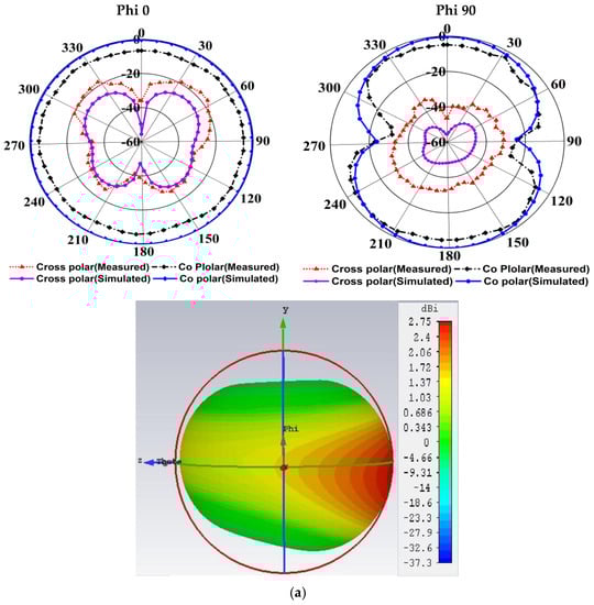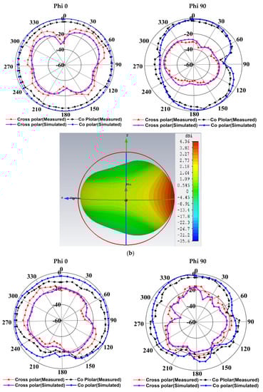 Figure 10 demonstrated two dimensional (2D) and three dimensional (3D) radiation patterns, including the measured and simulated cross-polarization and co-polarization of three resonance frequencies of 3.50 GHz, 6.45 GHz, and 10.20 GHz respectively. The Theta () and Phi (φ) spherical coordinates are associated with the Cartesian axis alignments such as, when Phi = 0° then, Theta () = 0° to 360° degrees is called the XZ cut, and when Phi (φ) = 90°, Theta () = 0° to 360° degrees is known as YZ cut, as well as when Theta () = 90°, Phi (φ) = 0° to 360° degrees is assumed the XY cut. The YZ-plane (φ = 90°) is called as H-plane as well as the XZ-plane (φ = 0°) is called as E-plane. From the near field measurement, it is remarkable that the proposed prototype is directional, and the main radiation direction is towards. The significant lobes of the radiation patterns are permanent towards the end-fire direction over the whole frequency band. The proposed prototype demonstrates a steady directional radiation pattern over the entire operating band and resonance frequencies, but at higher frequencies, the radiation of the antenna is slightly omnidirectional with some back lobes. However, at the frequencies 3.50 GHz, 6.45 GHz, and 10.20 GHz, the antenna exhibitions a distinctive eight shapes of the radiation pattern. Moreover, at a higher frequency, the prototype demonstrates directive cross-polarization due to fluctuating the current distribution as well as some slots. Besides, at higher frequency (i.e., 10.20 GHz) frequency, the current does not dispense consistently owing to the upper sequence current mode excitation that produced the radiation directive. Furthermore, at upper frequencies, several nulls may rise in current distribution that generates few back lobes.
