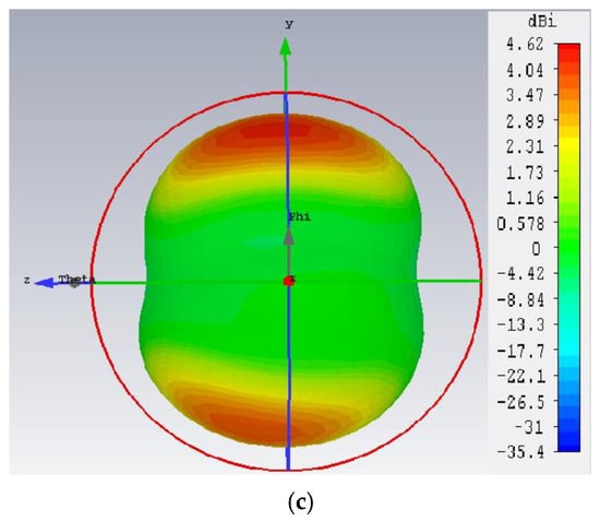 Two dimensional and three-dimensional radiation patterns of the prototype at different frequencies: (a) 3.50 GHz; (b) 6.45 GHz; (c) 10.20 GHz.