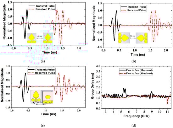 Figure 11 illustrated three types of setups for the measurement of the time-domain performance of the antenna. The first one is face to face (F2F); the second one is side-by-side (SbS) (X-axis), and the third one is side-by-side (SbS) (Y-axis). For measurement purposes, the distance between the antennas is considered as 240 mm for three scenarios. It is observed that, overall, in three scenarios, the waveforms are almost similar for transmitted and received pulses, except it spread marginally. As a result, it is concluded that the antenna can radiate a short pulse with minimal alteration. However, for SbS (Y-axis) (i.e., Figure 11b) and F2F (i.e., Figure 11c) scenarios, the received waveforms are similar to the transmitted pulses, due to the high directivity of the antenna. On the other hand, for SbS (X-axis) (i.e., Figure 11a) scenario, the received and transmitted pulses are not the identical precisely, because of the antenna’s directional radiation characteristics. Aimed at directional radiation, the side radiation a little bit distorted as well as the inequality is observed among the received and transmitted signals. Therefore, received and transmitted magnitudes are not of equivalent shape. It is known that the term fidelity factor is considered to validate the correlation between the transmitted and received pulses. It means that the highest magnitude of the cross-correlation between the transmitted and received signals. The fidelity factor (FF) is calculated in the MATLAB programming platform by using the following formula: