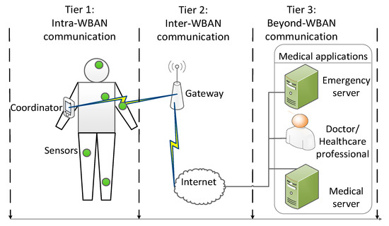 Wireless body area networks (WBANs) contain a coordinator and several biomedical sensors to collect vital signals in the human body using short-range wireless links. Recently, three physical layers for wireless communication in or around the human body have been recommended by the Institute of Electrical and Electronics Engineers (IEEE) standard for WBANs: Human body communication (HBC), narrow band, and ultra-wide band [1]. WBANs offer various applications in both medical and non-medical fields; for instance, monitoring emergency data and collecting the periodic data of patients in hospitals [2,3,4]. Figure 1 shows the typical architectural scenario for WBANs in medical applications in a three-tier communication model [2,3]. In the typical application at home, the elderly can wear some biosensors which will collect vital signals, such as blood pressure. Those vital signals are sent to the Internet gateway then forwarding to the doctor at the remote site. In another application at the hospital, some patients may send different types of vital data according to their sickness to the central gateway of the hospital. The central gateway will collect data from multiple WBANs and subsequently transmit the data to different servers, according to the type of traffic. For example, the emergency data packet from WBANs will be transmitted to the emergency server, while the monitoring data will be transmitted to the doctor.