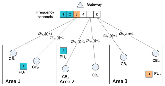 In the network scenario in Figure 2, the gateway maintains the working channel for the CRBANs, according to the primary users’ activities. We assume there are three areas; each area has several CRBANs and primary users. The gateway can sense the idle channels in the network. The gateway assigns idle channel Ck to CBi denoted as Chi,k(t) = 1 according to the primary users’ activities in each area. For example, CB1 can occupy channel C3 denoted as Ch1,3(t) = 1 in area 1 because primary user PU1 is working at channel C1.