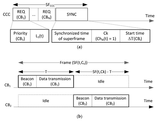 where the priority value of each sij is denoted as pij, pij ∈ {p1, p2, p3}. The list of detected idle channels is created at the coordinator of CRBAN (1). At the beginning of each frame, each CRBAN sends the REQ packet containing the priority value CBi denoted as p(CBi) and the list of detected idle channels Li(t) in the common control channel, as shown in Figure 3a. The priority value has two bits representing three different levels of traffic priority: {p1, p2, p3}. The gateway will schedule CRBANs at different channels according to the priority of traffic, as shown in Algorithm 1, and subsequently broadcast the schedule in the SYNC packet in the common control channel, as shown in Figure 3a. The SYNC packet contains the synchronized time of superframe, the data channel for CRBAN Chi,k(t) = 1, and the ΔT(CBi) is the start of a superframe of Bi after the synchronized time of superframe.