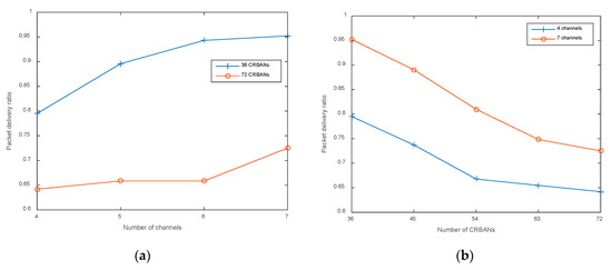 Packet delivery ratio: (a) varying the number of channels; (b) varying the number of CRBANs.