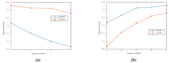 Delay per packet: (a) varying the number of channels; (b) varying the number of CRBANs.