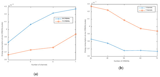 Energy consumption at one CRBAN: (a) varying the number of channels; (b) varying the number of CRBANs.