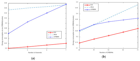 Energy consumption: (a) varying the number of channels; (b) varying the number of CRBANs.