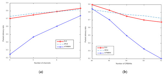 Packet delivery ratio (PDR) is the ratio of the number of successfully received packets at the gateway to the number of the generated packets at CRBANs. As shown in Figure 9a, PDR increases proportionally to the number of channels. ELS and PSLS perform better than IoTWBAN; the reason is that, in ELS and SPLS, the channel selection algorithm is used to select one idle channel, as well as schedule the transmission of multiple CRBANs in one channel. On the other hand, PDR decreases in ELS, SPLS, and IoTWABN if we increase the number of CRBANs, as shown in Figure 9b. SPLS and ELS achieve high and similar PDRs; in a dense network of 72 CRBANs, PDR is about 70%, which is acceptable. However, IoTWBAN has the lowest PDR because CRBANs need to select an idle channel without interfering to other IoT devices. If the number of IoT devices is high, the CRBANs will content with IoT devices, which may cause a less number of successfully received packets.