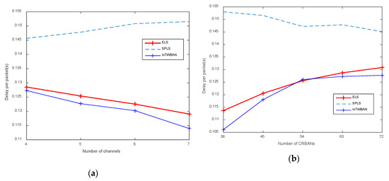 As in Figure 10a, packet delay is inversely proportional to the number of channels. Our proposed ELS algorithm performs better than SPLS. However, ELS’ latency is slightly higher than IoTWBAN’s; the reason is that the ELS algorithm requires CRBAN to sense the new idle channel, which may be different from the current working channel. Therefore, CRBAN needs to switch to another channel to continue its transmission, possibly resulting in longer delays. As shown in Figure 9a, the latency is less than 130 ms, which is acceptable for most applications. Although the latencies are low in multiple available channels, they tend to increase proportionally to the number of CRBANs, as shown in Figure 10b. As multiple CRBANs occupy one channel, the latency will increase, and ELS performs slightly better than IoTWBAN and better than SPLS.