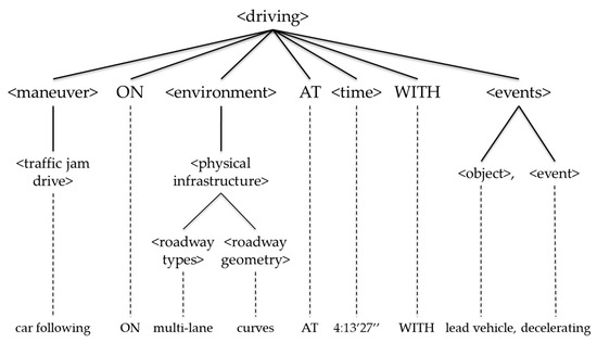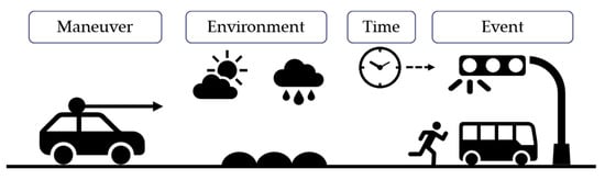 The meaning of this sentence is that driving is a maneuver in the environment with events that can exist together. The maneuver, environment, time, and events can have the following details. In Table 1, the first stage of each component is presented. The components are refined up to the fourth stage. Details of four-step stages are presented in Appendix A.