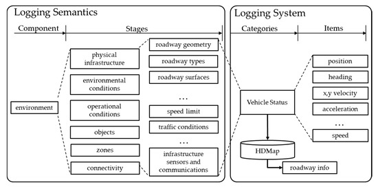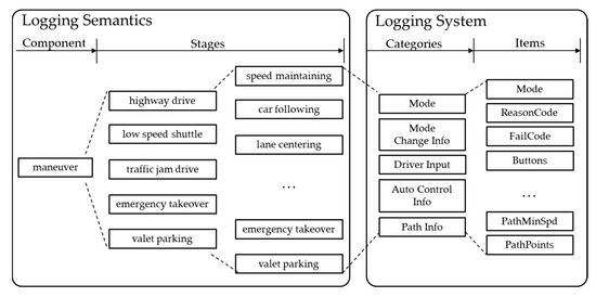 The autonomous driving system usually consists of perception, planning, and control modules. The maneuver, environment, time, and events are appropriately handled in these three modules to perform autonomous driving. Although they cannot be mapped exclusively, basically, maneuvers will be processed in the planning module, and environment and events will be processed in the perception module. Of course, vehicle control will be done in the control module too. To record how the autonomous driving system responds to environments and events and reacts to maneuvers, it must be able to record detailed information about the perception, planning, and control modules. Therefore, the logging item is based on recording the planning result that determined the maneuver by perception, adding the perception result to the information corresponding to events and the environment.