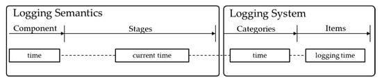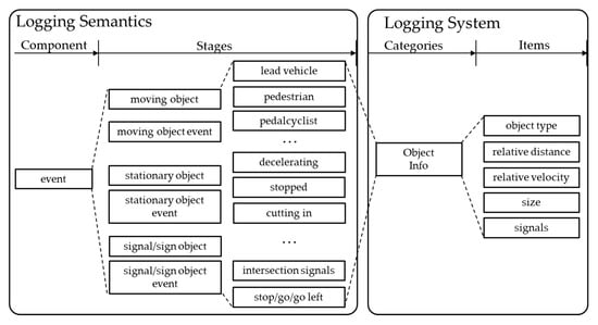 Based on formal specifications for driving, the logging system records four components: maneuver, environment, time, and event. Each component has multistep stages. Note that the actual logging data are items, as in Table 1, which are aggregated into categories. These categories are mapped to stages of components from formal specifications described above. By separating formal specifications and logging units, various stages of each driving component can have independent and recurring logging data such as acceleration, target speed, etc.