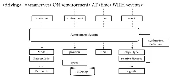 According to A Framework for Automated Driving System Testable Cases and Scenarios, defined by the NHTSA [22], a driving test is composed of four major behaviors or elements: Tactical Maneuver Behaviors (TMBs), Operational Design Domain (ODD) elements, Object and Event Detection and Response (OEDR) behaviors, and Failure Mode Behaviors. In this case, Failure Mode Behaviors are a special group for autonomous driving. So, it can be excluded from the general driving situation. As a result, general driving can be performed by constituting the above three types: TMB, ODD, and OEDR. In more general terms, this can be interpreted as the maneuver a driver is going to control, the environment in which you drive, and the events that occur while driving. In other words, driving is performed in the environment while performing the maneuver, and it can be seen that the event is encountered in the middle of the related processing. So, you can log data of these components to find out the situation and analyze the problems.