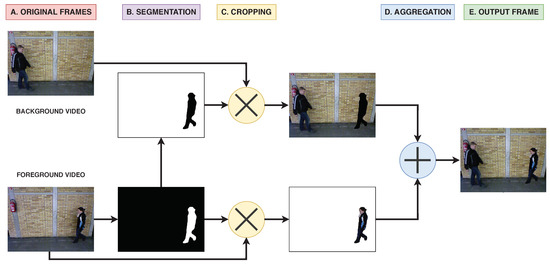 - Aggregation. Finally, both videos are combined. This is an easy operation since a simple element-wise add operation is applied between the cropped frames of both videos as seen in Figure 1D,E.