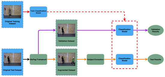 - The goal of the first experiment, represented by purple arrows in Figure 3, is to validate the suitability and correctness of the augmented dataset. Thus, MuPeG is used to generate videos from the original test dataset with just one subject per video. These new videos constitute the validation test dataset, as indicated in Figure 3. By this way, the generated videos contain the same information than the original test dataset, but using segmented/aggregated subjects with MuPeG. Now, those videos are tested using a model trained on the original training set. The obtained test accuracy should be close to the accuracy obtained on the original test videos. If this condition is satisfied, we can assume that MuPeG is able to generate accurate augmented videos and more complex experiments, as the following one, could be performed.