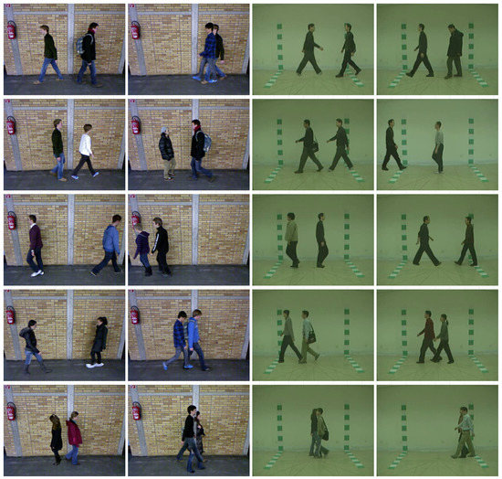 - MultiCASIA-B dataset. This second augmented dataset is based on CASIA-B dataset and, like with MultiTUM-GAID, we only generate test samples because the training samples are the same ones used for training in CASIA-B. The test video sequences of this new dataset, called augmented test dataset in Figure 3, are built using our framework MuPeG by merging two original test videos randomly chosen from CASIA-B dataset. Note that following the experimentation setup proposed in References [23,24], the first 74 subjects with all cameras are used for training and the last 50 subjects are used for testing. Thus, we focus on videos labeled as nm-5, nm-6, bg-1, bg-2, cl-1 and cl-2 for the last 50 subjects and the camera. Again, to avoid segmentation problems caused by backpacks or coats, only ‘nm’ videos are used as foreground. For the background, all videos are used. Overall, the augmented dataset used as test is composed of 50 subjects with a total of 600 videos. As in TUM-GAID, the combination of subjects is performed at random. The number of occurrences per subject differs between 17 and 36 videos, with the same average of 24 videos per subject.