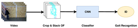 Pipeline for gait recognition. Pipeline based on References [24,41]. The input is a sequence of RGB frames where optical flow is calculated. Then, optical flow is cropped and stacked in 25-frame subsequences, keeping the subject centered in the 13th frame. Finally, the subsequences are passed through a CNN and classified by a SoftMax layer.