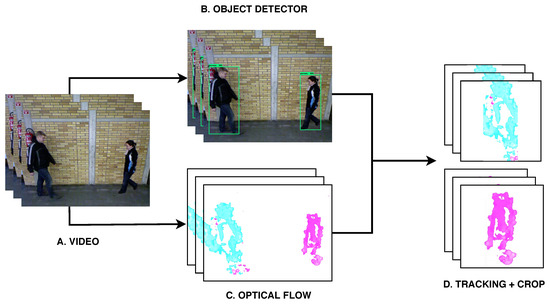 Input data generation. (A) The original data are sequences of video frames. (B) Persons appearing in the frames are detected and localized using an object detector. (C) Optical flow is computed for each pair of frames. (D) For each subject, optical flow maps are cropped and combined to produce a common output.