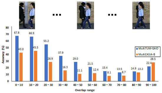 Figure 7. Accuracy under different grades of overlap. Each bar represents the accuracy of a different grade of overlap of the subjects present in a sample. More details in the main text. Blue bars correspond to TUM-GAID results, while orange bars correspond to CASIA-B results.