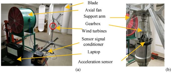 To verify the effectiveness of the proposed GTL method algorithm, an experimental setup was installed as shown in Figure 2. In this experiment, as shown in Figure 2a, wind power was supplied by an axial flow fan (SWF-1-10), which drove the blades on the wind turbine (RCVA-3000) to rotate and then generate electricity. Three acceleration sensors and one acoustic emission sensor were mounted on the machine (RCVA-3000) near the gearbox. The acceleration sensor was connected to the sensor signal conditioner (PCB) and then connected to the high-speed data acquisition card (SQI, max sampling frequency: 1 MHz). Finally, the card was connected to the computer via a USB cable. A partial view of how the sensor was positioned on the wind turbine is shown in Figure 2b. During the experiment, we controlled the axial fan to move at different speeds. The sampling time for one acquisition was 20 s. The frequency converter that controlled the speed of the axial fan was set to 50 Hz. The axial fan drove the blades and generated the vibration signals that was acquired by the acceleration sensor. Each step of the faulty condition experiment was repeated 10 times to make sure there was enough data.