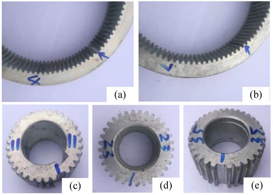 Five failure modes in the experiments: (a) ring gear with missing tooth; (b) ring gear with crack; (c) sun gear with missing tooth; (d) planetary gear root crack; (e) planetary gear with missing tooth.