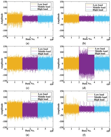 The raw signals: (a) C0 condition; (b) C1 condition; (c) C2 condition; (d) C3 condition; (e) C4 condition; (f) C5 condition.