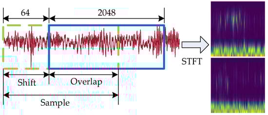 In this experiment, original signals under different load conditions, as shown in Figure 4, were collected from vibration accelerometers with 100k Hz sample frequency. We downsampled to 2500 Hz and chose every 2048 points as a sample. We also used a simple data augmentation trick, shown in Figure 5, to solve the problem of inadequate data, with the shift length of 64. After that, every sample was transformed by a short-time Fourier transformation with 128 window length from the time domain to the time–frequency domain so that it can feed into a two-dimensional convolutional neural network.