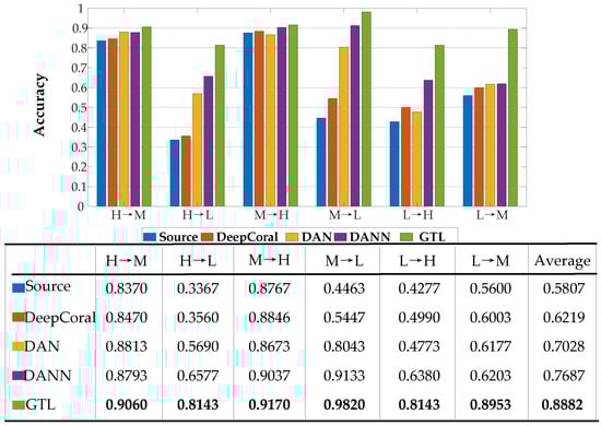 The transfer tasks between H and M, all methods showed up to 80% accuracy, and the GTL method was only around 7% and 4% higher than the other methods in task H→M and task M→H, respectively. However, when adapting H→L and L→H, the accuracy of the proposed GTL method was at least 15.66% and 17.63% better than the other methods. The average accuracy of 0.8882 in the whole transfer task with the GTL algorithm was far better than the other methods.